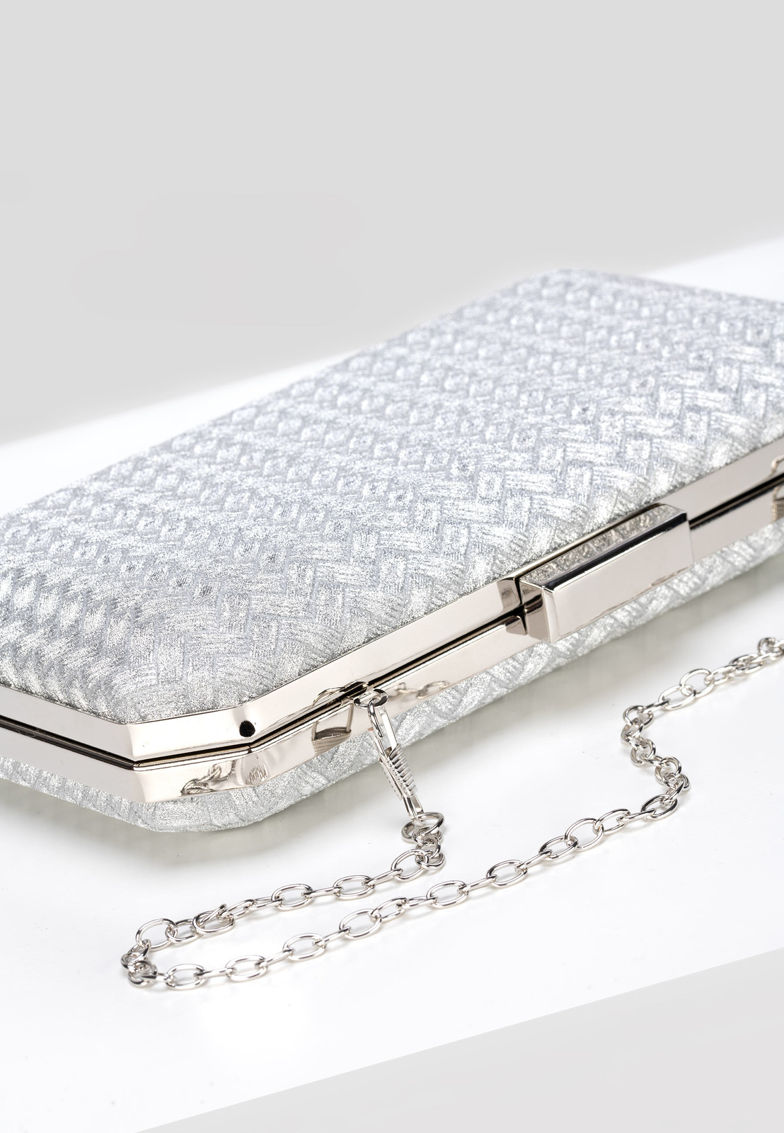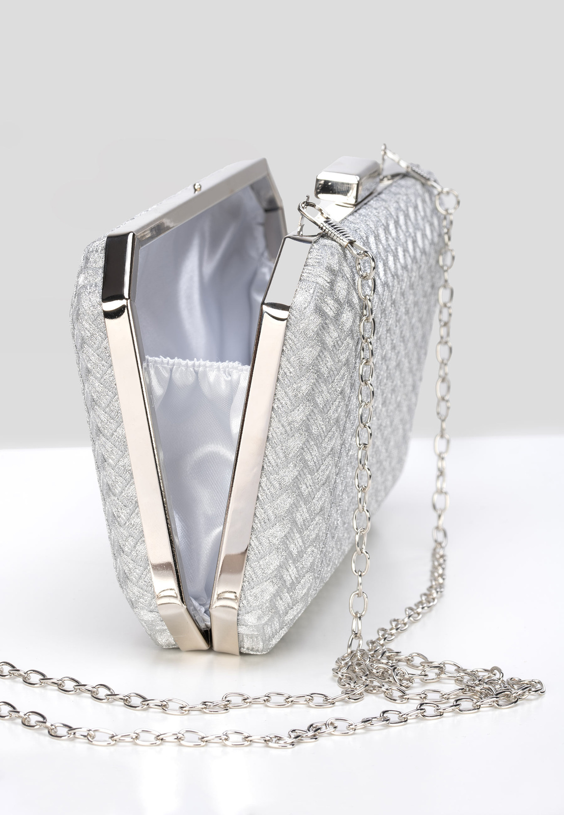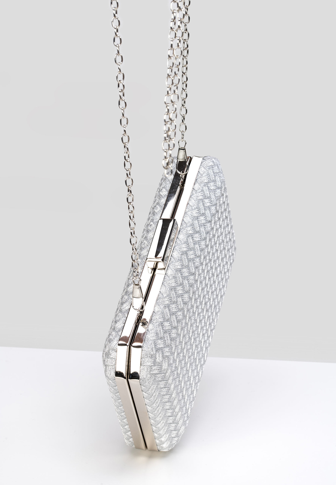 Wizytowa torebka w srebrnym kolorze, stworzona z myślą o eleganckich wyjściach. Wykończona srebrnymi detalami i oryginalnym zapięciem, które nadaje jej eleganckiego charakteru. Zapinana na praktyczny zatrzask, a jej kompaktowy rozmiar sprawia, że świetnie mieści najważniejsze drobiazgi i wygodnie nosi się ją w dłoni. Dla wygody posiada dopinany, srebrny łańcuszek na ramieniu. Doskonały dodatek do wieczorowej sukni lub szykownej stylizacji. Torebka dostępna także w kolorze różowo-złotym i czarno-złotym.
