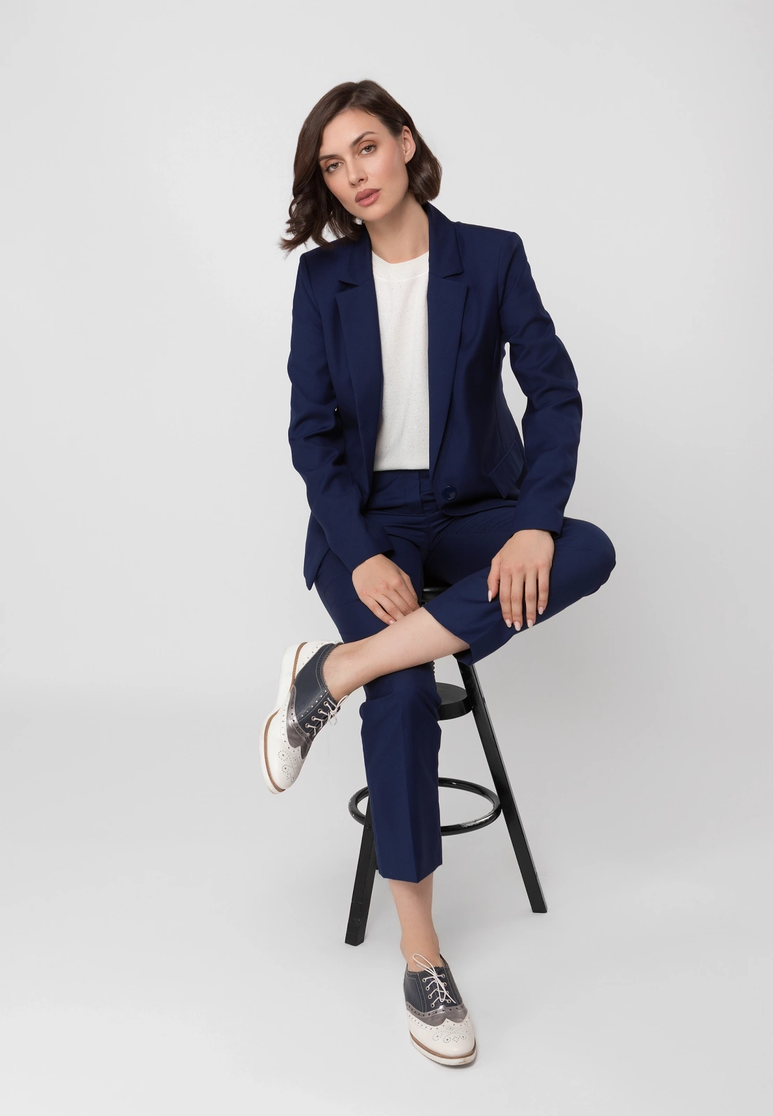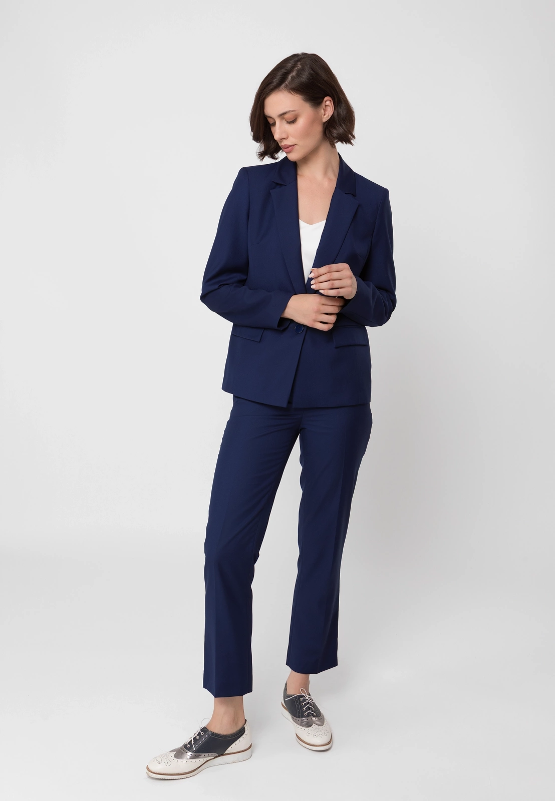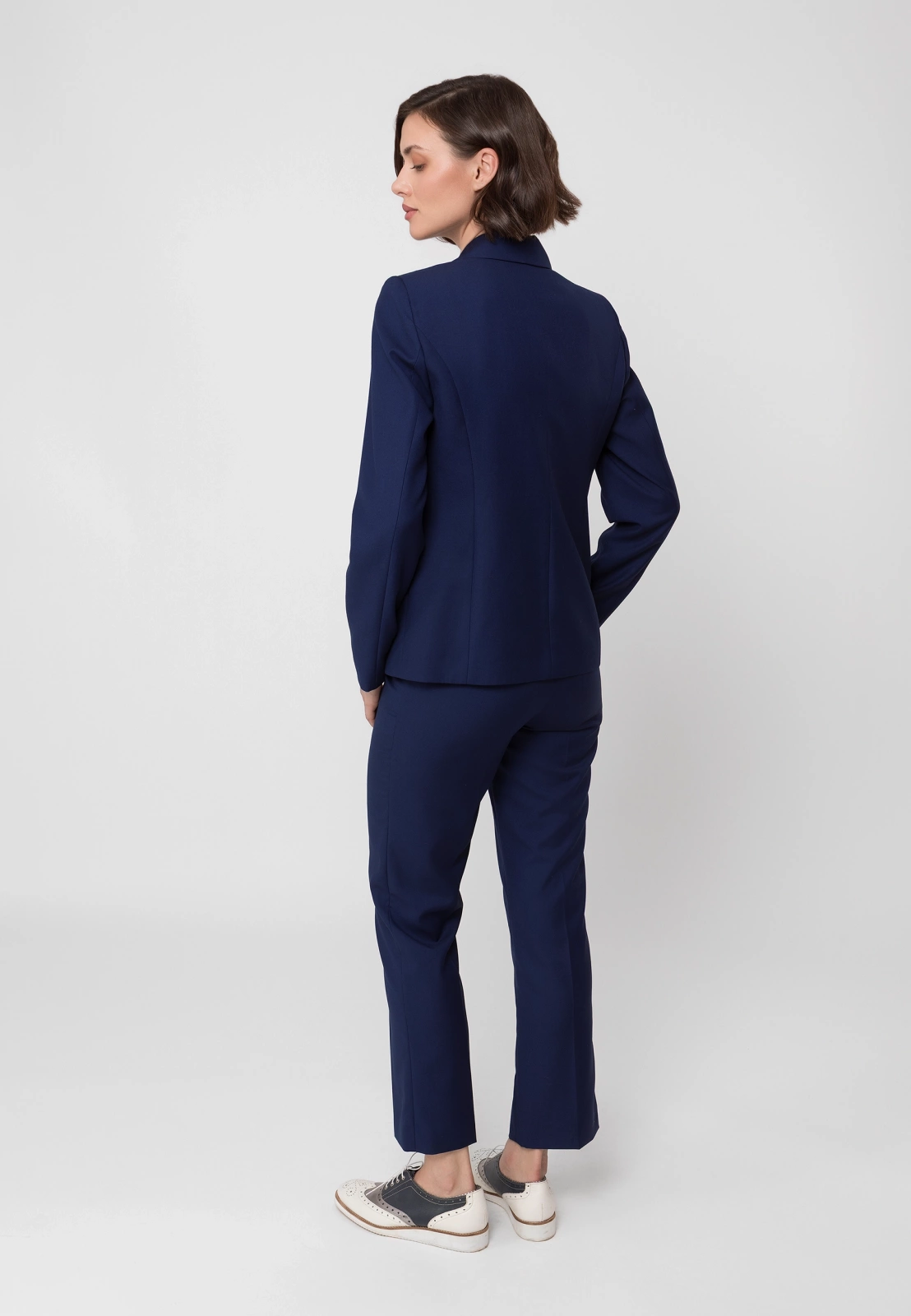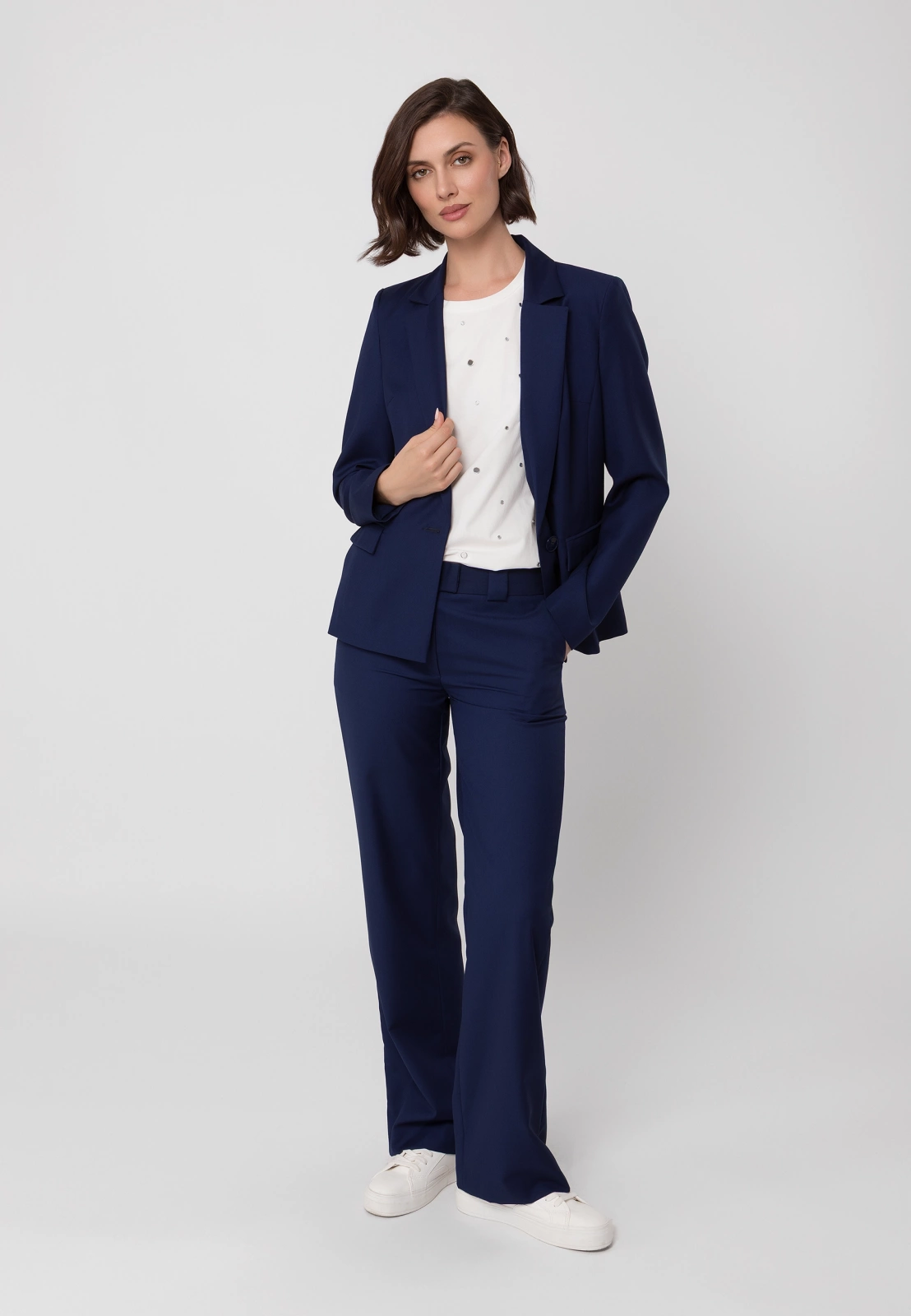 Idealnym uzupełnieniem są spodnie cygaretki ⅞ lub spodnie z długą nogawką uszyte z tej samej tkaniny, które razem tworzą klasyczny granatowy garnitur. W zależności od dodatków pozwala stworzyć zarówno profesjonalny look biznesowy, jak i bardziej casualową stylizację na co dzień. To wszechstronny element garderoby, który pozostanie aktualny przez wiele sezonów
