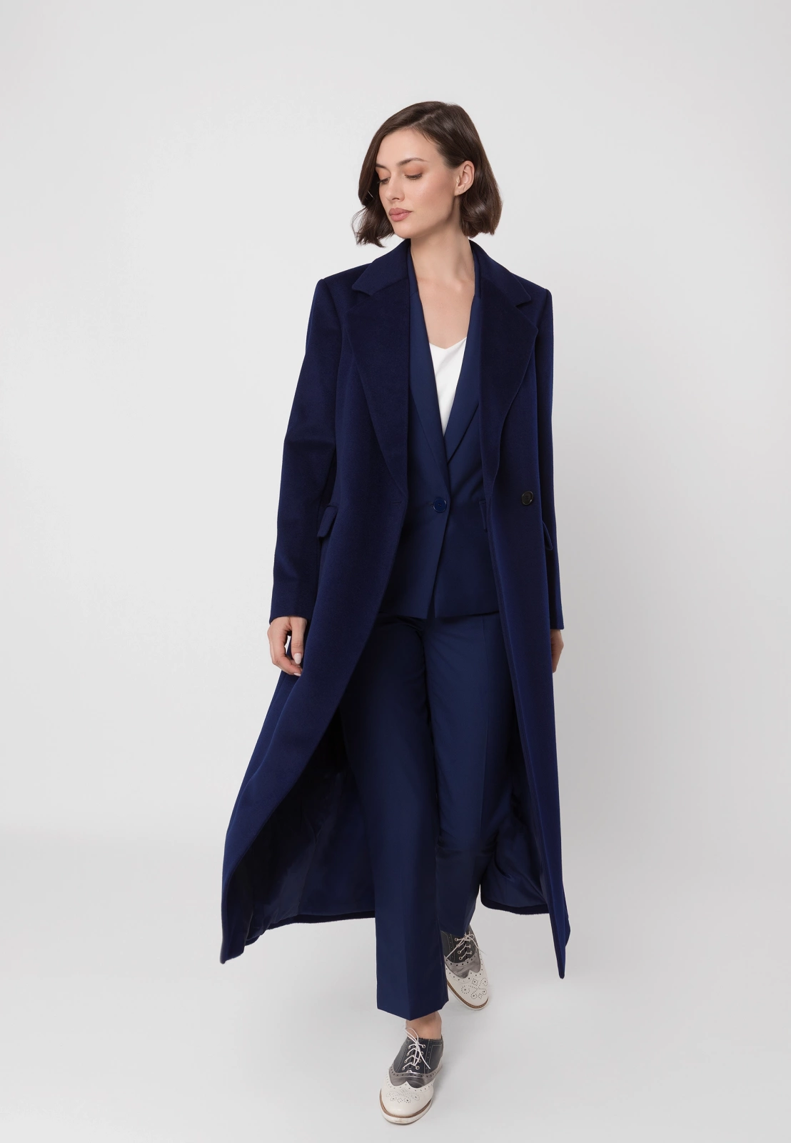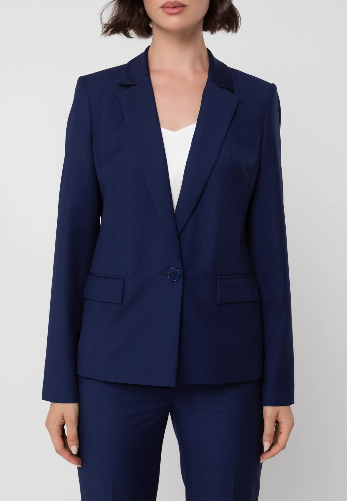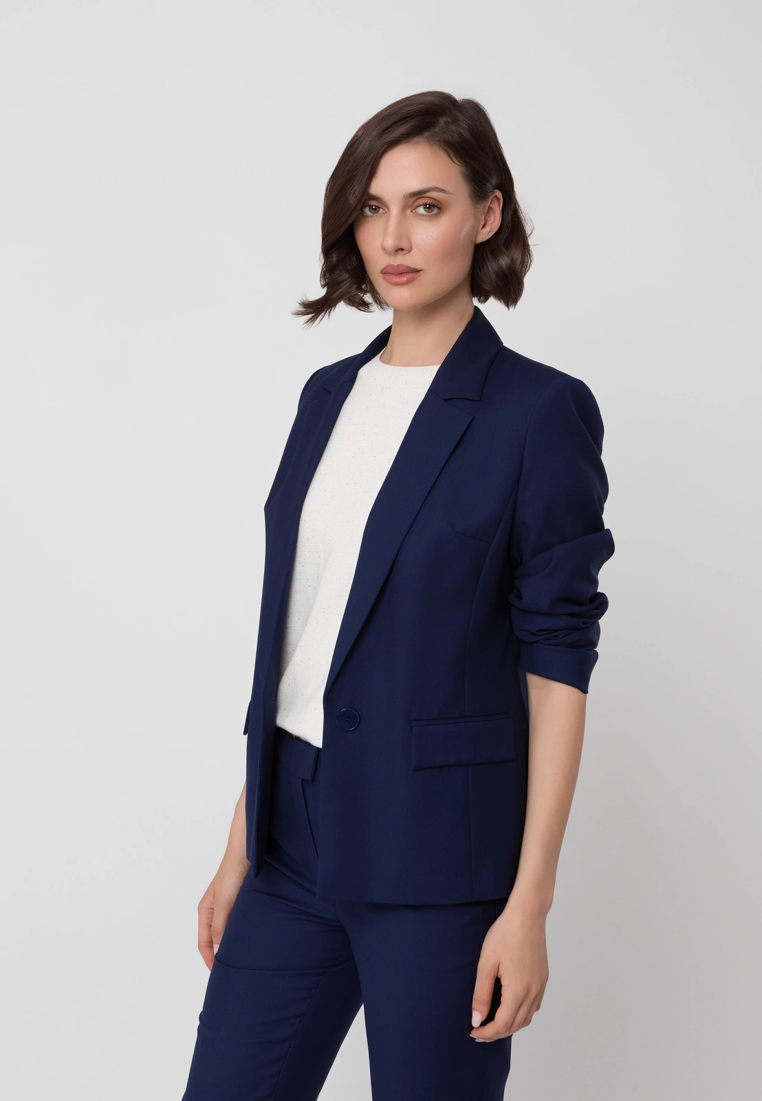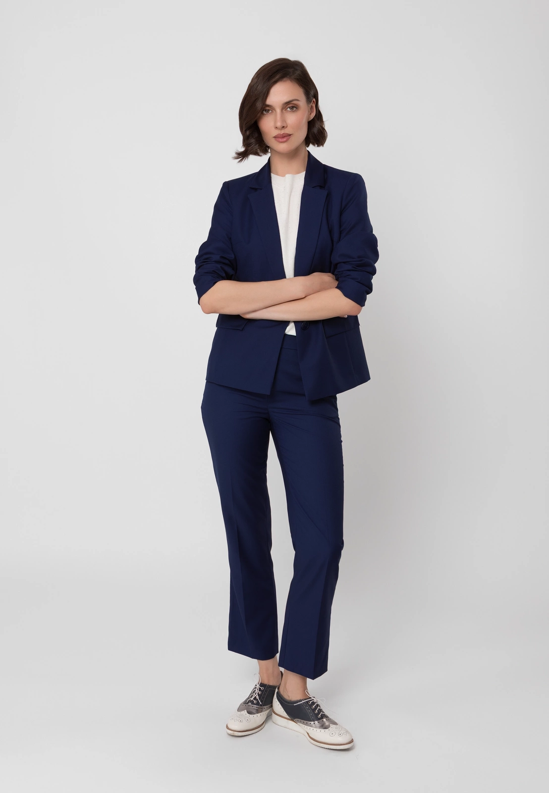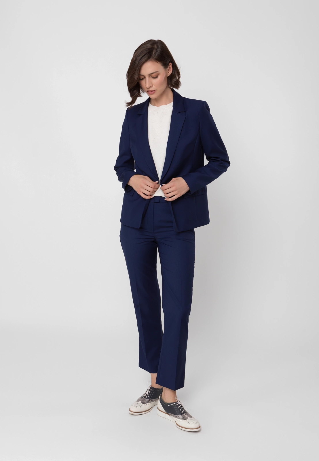 Idealnym uzupełnieniem są spodnie cygaretki ⅞ lub spodnie z długą nogawką uszyte z tej samej tkaniny, które razem tworzą klasyczny granatowy garnitur. W zależności od dodatków pozwala stworzyć zarówno profesjonalny look biznesowy, jak i bardziej casualową stylizację na co dzień. To wszechstronny element garderoby, który pozostanie aktualny przez wiele sezonów