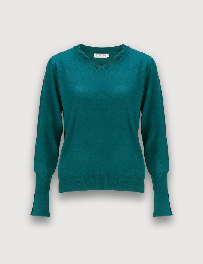Zielony sweterek z dekoltem w serek to model o klasycznym kroju oraz wyjątkowym kolorze – intrygującym, morskim odcieniu zieleni. Ciekawym akcentem są niewielkie rozcięcia na mankietach, które nadają nonszalancki efekt. Sweter został wykonany z miłej w dotyku dzianiny z dodatkiem wełny. Świetnie wygląda z jeansami czy cygaretkami. Sprawdzi się na różne codzienne okazje.